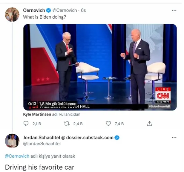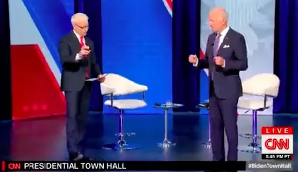 Ancak canlı yayın sırasında bu önemli açıklamaların tümünün önüne geçen bir olay yaşandı. İzleyicilerin dikkatinden kaçamayan ve sayısız kullanıcı tarafından başta Twitter olmak üzere hemen tüm Sosyal Medya platformlarından paylaşılan videoda ABD Başkanı Joe Biden'ın sunucu Anderson Cooper'ın karşında ayakta durup soruları yanıtlarken yaptığı el hareketi tüm dünyada adeta şok etkisi yarattı.