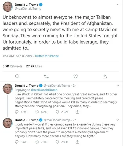 ABD Başkanı Trump, "Önemli bazı Taliban liderleri ve Afganistan Cumhurbaşkanı, bu pazar günü ayrı ayrı Camp David'e geleceklerdi. Onlar bu gece ABD'ye geliyorlardı. Fakat maalesef, yanlış bir koz elde etmek amacıyla onlar (Taliban), Kabil'de 11 kişinin ve bizim de büyük bir askerimizin hayatına mal olan saldırıyı üstlendiler. Derhal bu görüşmeyi iptal ettim ve barış görüşmelerini durdurdum." ifadelerini kullandı.
