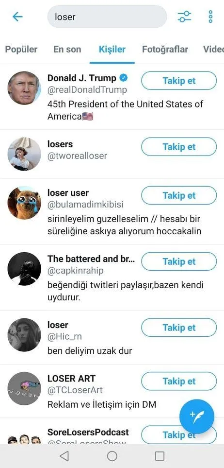 Türkçe karşılığı 'kaybeden' olan 'loser' kelimesini Twitter'dan aratan kullanıcılar şok bir olayla karşılaştılar. Twitter'ın arama sonucunda kişiler kısmına Donald Trump'ın resmi hesabını yerleştirdiği görüldü.