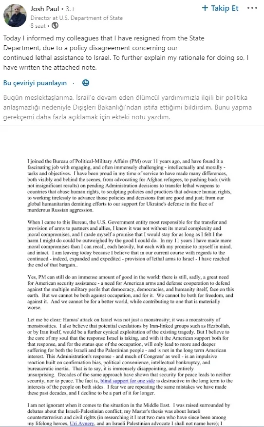 ABD hükümetinde üst düzey İsrail istifası! Josh Paul Gazze soykırımı için İsrail'e yapılan mühimmat sevkiyatının ardından istifa etti
