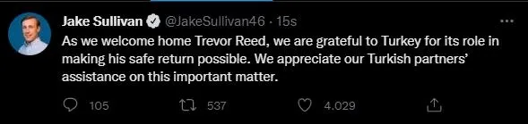 ABD Ulusal Güvenlik Danışmanı Jake Sullivan, "Güvenle gerçekleşen takas için Türkiye'ye minnettarız. Türk ortaklarımızın yardımlarını takdir ediyoruz." açıklamasında bulundu.