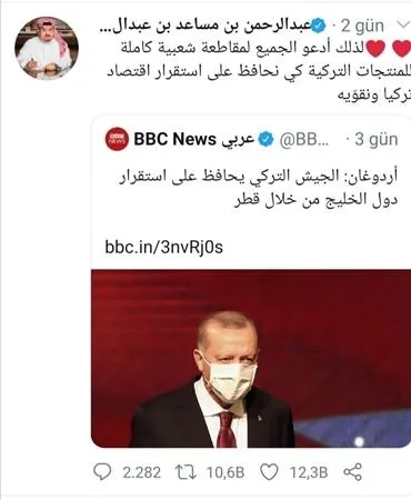 Aynı zamanda Suudi Arabistan Odalar Konseyi Başkanı da olan Ajlan Abdulaziz Al-Ajlan'ın ardından şimdi de ilk kez Suudi Arabistan'ı yöneten Suud Ailesi'nden boykot çağrısı geldi. Dünya'nın haberine göre Suudi Prens Abdulrahman Bin Musa'ad Al Saud, Başkan Recep Tayyip Erdoğan'ın Katar'daki Türk ordusunun Körfez'de güvenliği sağlamlaştırmaya yardımcı olduğunu açıklamasının ardından Suudi Prens, Türk ürünlerinin boykot edilmesi çağrısı yaptı.