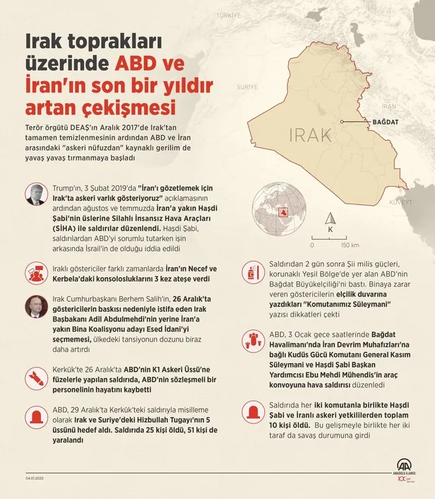 ABD Başkanı Donald Trump'ın Şubat 2019'da "İran'ı gözetlemek için ülkede asker bulunduruyoruz" açıklamasıyla artmaya başlayan ABD ve İran arasında Irak toprakları üzerinde yaşanan gerilim, İranlı general Kasım Süleymani'nin öldürülmesiyle zirveye çıktı. ABD, 2003'ten bu yana sadece 2011-2014'teki 3 yıllık çekilmenin dışında ülkenin farklı bölgelerindeki 9 askeri üssü ve 5 bin 200 askeriyle Irak'ta konuşlanıyor.