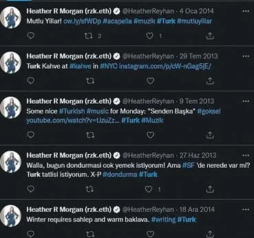 Heather Morgan'ın sık sık Türkiye'ye özgü içeriklerle paylaşımlar yaptığı ortaya çıktı. Kendisini "Turkish Martha Stewart" olarak tanıttığı anlaşıldı. Ancak Türk olduğuyla ilgili herhangi bir kayıta rastlanmadı.