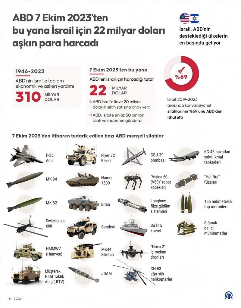 Biden yönetimi, 25 Aralık 2023'e kadar, 244 kargo uçağı ve 20 gemi aracılığıyla 2,4 milyar dolar değerinde 10 bin tondan fazla silah ve askeri malzeme gönderdi. Sadece ilk 6 haftada 15 binin üzerinde bomba ve 50 bin top mermisi İsrail'e ulaştı.
