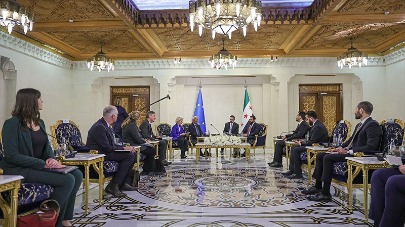 Avrupa Birliği Komisyonu Başkanı Ursula von der Leyen ile AB Konseyi Başkanı Antonio Costa, Suriye Cumhurbaşkanı Ahmed Şara ile Şam’da bir araya geldi. Esad rejiminin devrilmesinden bu yana ilk kez ülkeyi ziyaret eden Avrupa Birliği (AB) Konseyi Başkanı Antonio Costa ve AB Komisyonu Başkanı Ursula von der Leyen, Suriye'nin yeniden inşasına destek vereceklerini belirtti.