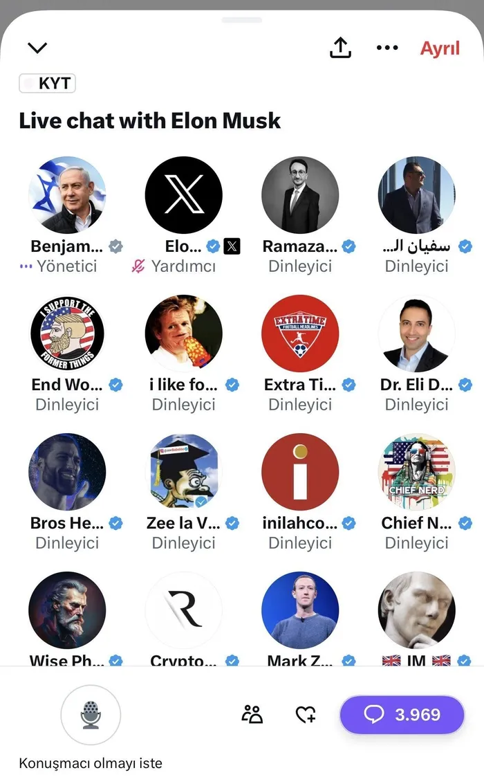 Katil Netanyahu ile Elon Musk, X'te sohbet odası açtı. Mark Zuckerberg de katıldı. İşgalci İsrail destekçisi çok sayıda şirketin X'ten reklamlarını çekmesinin ardından Musk'ın yaptığı bu ziyaret, "Büyük şirketler reklamları durdurunca Elon koşarak İsrail'e gitti" şeklinde değerlendirmelere yol açtı.