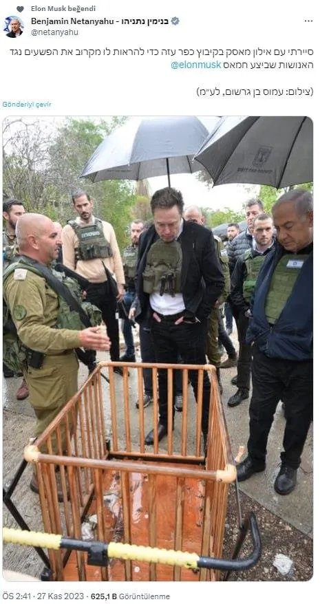 İsrail'i ziyaret ederek Başbakan Binyamin Netanyahu ve Cumhurbaşkanı Herzog ile gerçekleştirdiği görüşmelerin ardından konuşan Musk, "İnsanların öldürüldüğü (İsrail) yerleri görmek, kesinlikle duygusal açıdan zor bir gündü diyebilirim. Az önce Başbakan Netanyahu ile de konuştum. Bence Gazze ile ilgili üç şey var. (Hamas'ı kast ederek) Sivilleri öldürmekte ısrar edenleri öldürmekten başka bir seçenek yok. Fikirlerini değiştirmeyecekler." dedi.
