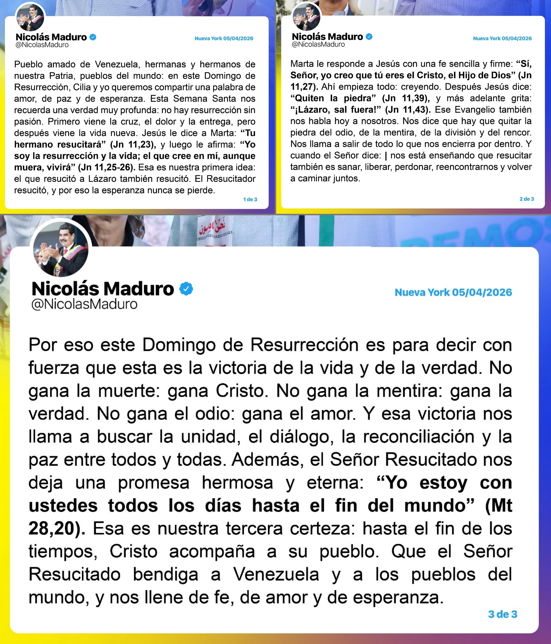 "Venezuela'nın sevgili halkı, vatanımızın kız ve erkek kardeşleri, dünya halkları. Bu Diriliş Pazarı'nda Cilia ve ben sevgi, barış ve umut dolu mesaj paylaşmak istiyoruz. Bu kutsal hafta bize çok derin gerçeği hatırlatıyor: Çile olmadan diriliş olmaz. Önce çarmıh, acı ve teslimiyet gelir ancak ondan sonra yeni hayat başlar."