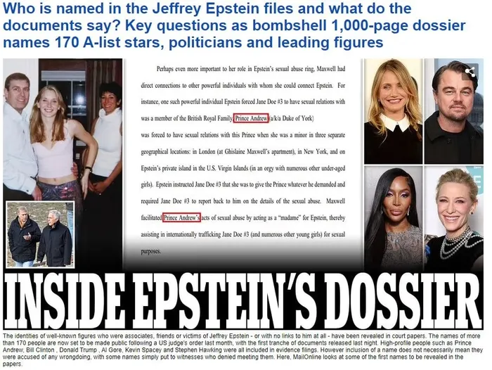 The Telegraph gazetesinin internet sitesindeki haberde, "Prens, Başkanlar, Popun Kralı: Jeffrey Epstein belgelerinde adı geçenler" başlığını kullandı. Haberde Prens Andrew'un yanı sıra eski ABD Başkanları Clinton ile Donald Trump, şarkıcı Michael Jackson, bilim insanı Stephen Hawking ve illüzyonist David Copperfield'ın adının belgelerde geçtiği belirtildi.