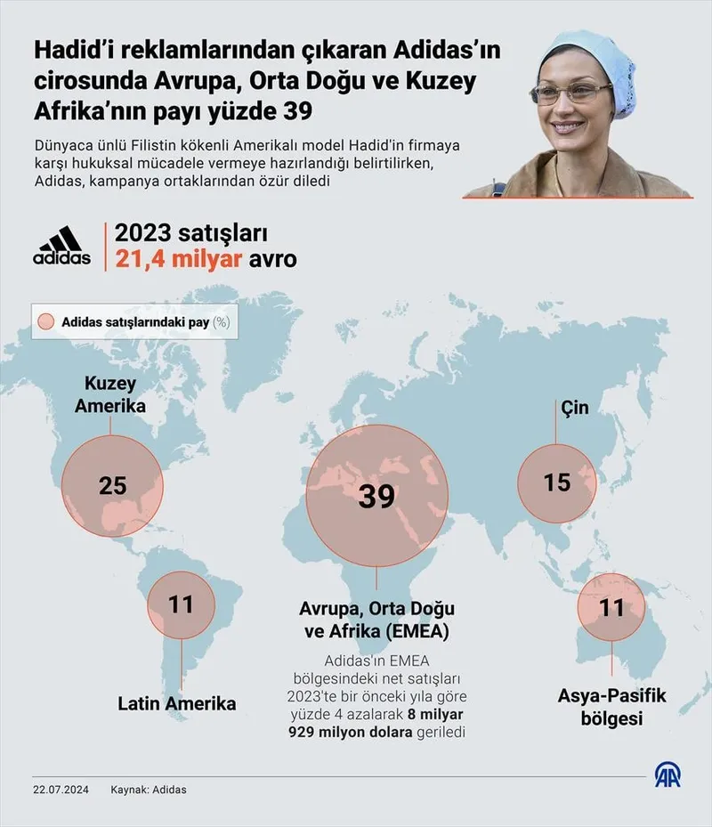Adidas'ın EMEA bölgesindeki net satışları 2023'te bir önceki yıla göre yüzde 4 azalarak 8 milyar 929 milyon dolara gerilemişti. Alman şirket, 2023'ü de 63,4 milyon dolar zararla kapatmıştı.
