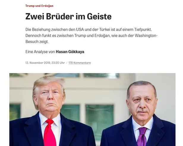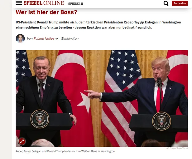 Başkan Recep Erdoğan ile ABD Başkanı Donald Trump'ın düzenledikleri ortak basın toplantısında yaptığı açıklamalar, Alman basını kıskançlık krizine soktu. Spiegel Online, “Patron Kim?' başlığıyla yayımladığı analizde, “Sanki dünyanın en güçlü ülkesinin başkanı Trump değil de Erdoğan” yorumunda bulundu.