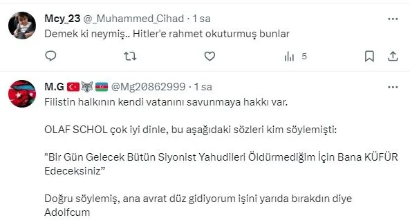 Scholz'un katil İsrail'in savunucusu olması ve Başkan Erdoğan sözleri sosyal medyada büyük tepki çekti.