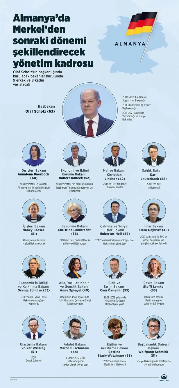 Merkel, 26 Eylül'de yapılan genel seçimlerden galip çıkan Sosyal Demokrat Partinin (SPD), Yeşiller ve Hür Demokrat Parti (FDP) ile kuracağı yeni hükümette Başbakanlık yapacak Olaf Scholz'a bugün görevini devredecek.
