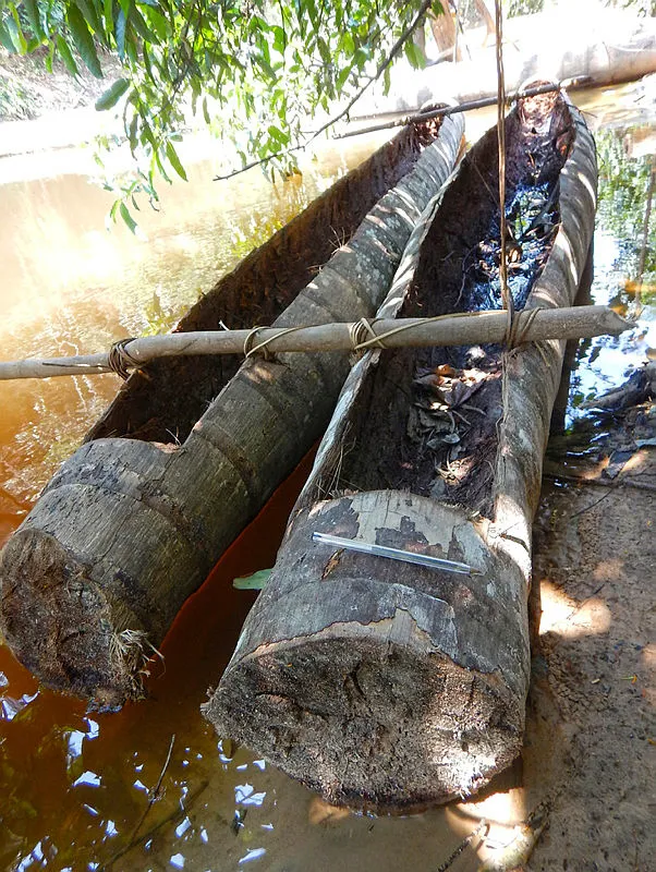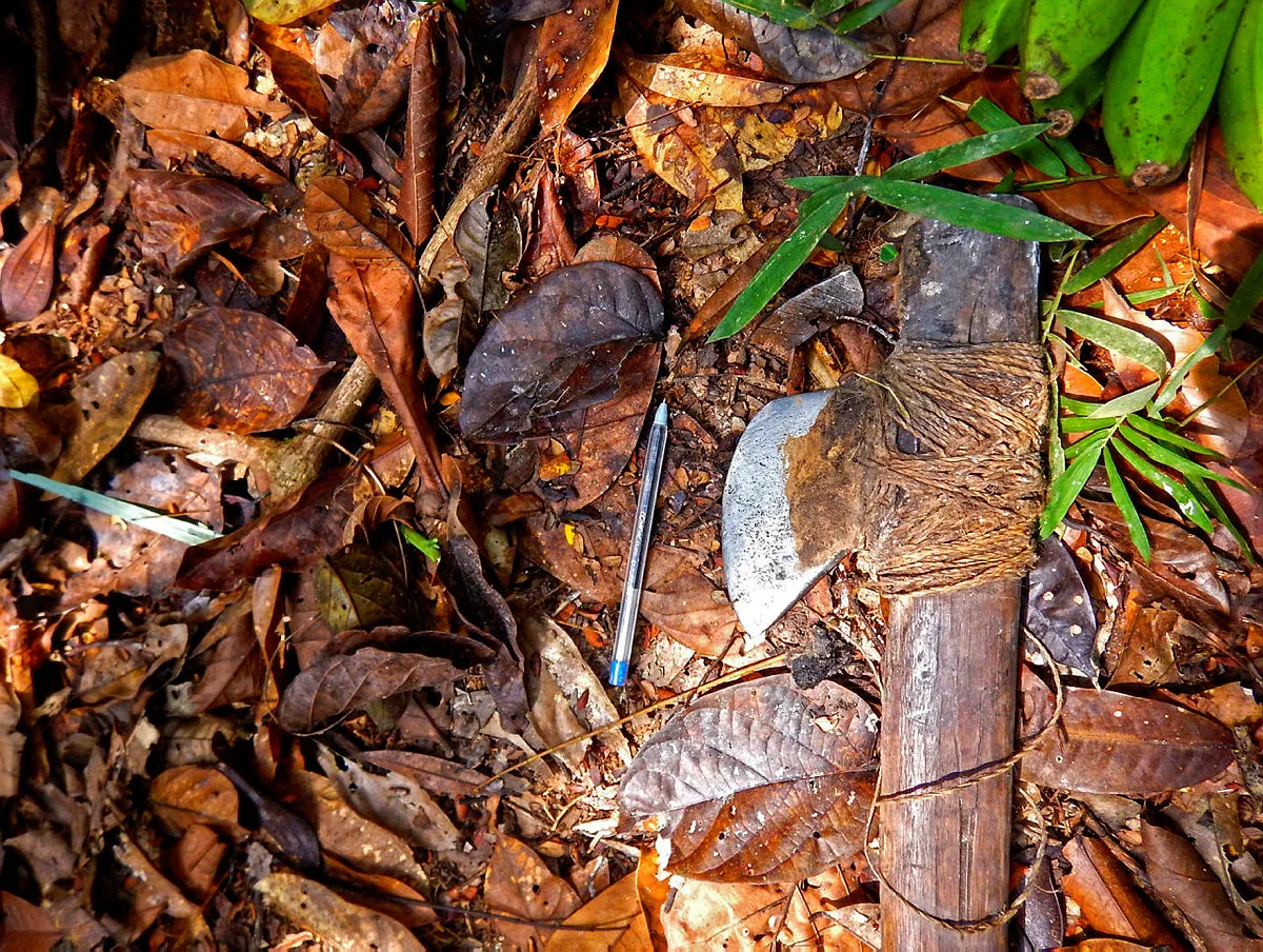 Brezilya hükümetinin yerli halklarla ilgili çalışan vakfı FUNAI tarafından bulunan bitkisel elyafla bağlanmış bir balta...