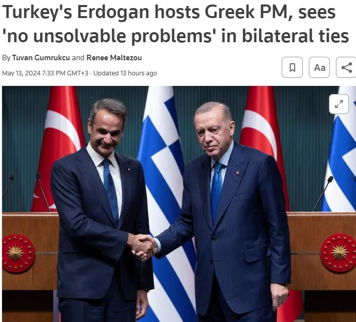 İngiliz Reuters ise Türkiye ve Yunanistan için "NATO müttefiki ve tarihi düşmanlar" ifadesini kullanırken Başkan Erdoğan'ın "Anlaşmazlıklara rağmen diyalog kanallarımızı açık tutarak olumlu bir gündeme odaklanıyoruz" şeklindeki sözlerine dikkat çekti. Reuters, ayrıca Başkan Erdoğan ile Miçotakis arasındaki Hamas anlaşmazlığına dikkat çekti.