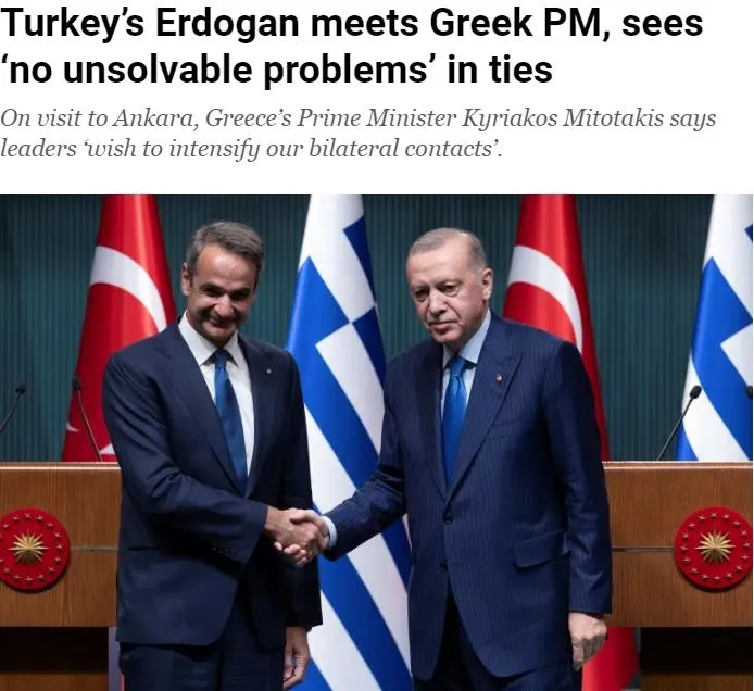 Başkan Recep Tayyip Erdoğan’ın Yunanistan Başbakanı Kiryakos Miçotakis’i kabul ederken dünya basını dakika dakika Ankara’yı takip etti. Batı ve İsrail basını Başkan Erdoğan ile Miçotakis arasında Hamas konusundaki anlaşmazlığı vurgularken Yunan basını ise “Ankara’da bol bol gülümseme vardı” dedi ve görüşmenin perde arkasını yazdı. Özellikle Cumhurbaşkanlığı Külliyesi’nde Miçotakis için düzenlenen yemeğe dikkat çeken Yunan basını Başkan Erdoğan’ın masasına dikkat çekti. İşte, manşet manşet Başkan Erdoğan-Miçotakis zirvesi…