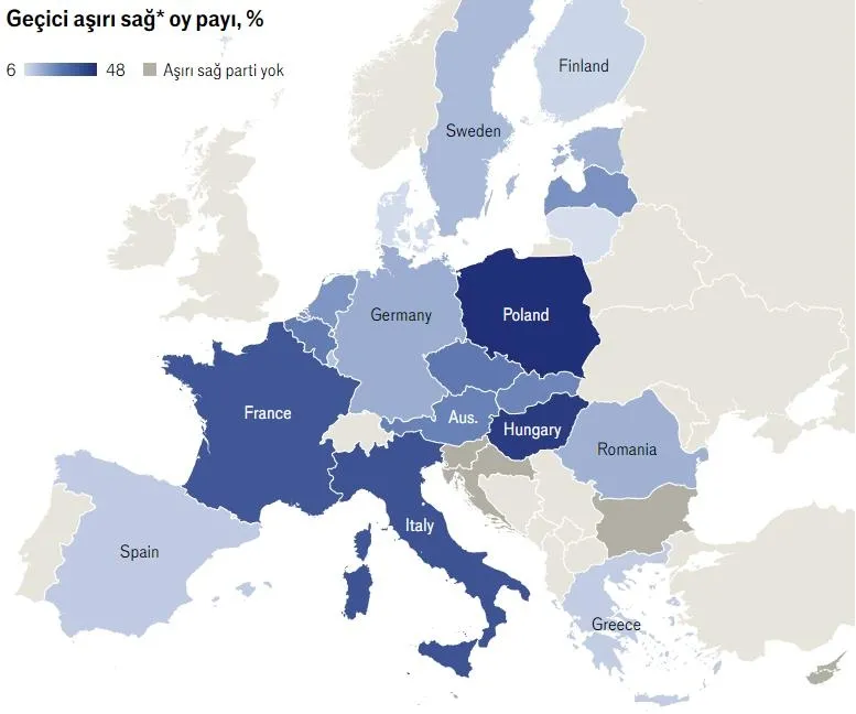Aşırı sağ partiler mevcut verilere göre 26 AB üyesi devletin sekizinde birinci ya da ikinci sırada yer alıyor.
