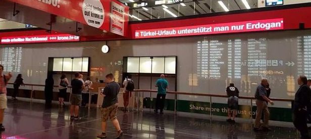 Viyana Havalimanı'na gidenler, turizm sezonunda Türkiye'yi kötüleyen "TürkiyetatiliErdoğan'ı desteklemekten başka bir şey değil" yazısıyla karşılaştı.
