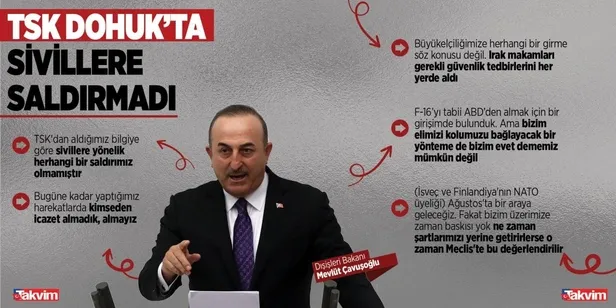 Bakan Çavuşoğlu, Dohuk'taki saldırıya ilişkin, "Bir kere daha vefat eden 9 kardeşimiz için Allah'tan rahmet diliyoruz. Yaralılara şifa diliyoruz, ihtiyaç olursa yaralıları Türkiye'ye getirebileceğimizi de söyledik. Tabii bu saldırıyla ilgili Türkiye'yi suçlayıcı, karalayıcı haberler de çıktı. Yaptığımız açıklamada da net bir şekilde de bunu yalanladık. Türkiye'nin hiçbir zaman sivillere yönelik bir saldırı gerçekleştirmediğini tüm dünya bilir. Uluslararası hukuka uygun bir şekilde biz terörle mücadelemizi sürdürüyoruz ve dün bu haberler gelir gelmez tabii ilgili kurumlarımızda de hemen istişareler yaptık, bilgi paylaşımları yaptık ve Türk Silahlı Kuvvetlerinden aldığımız bilgiye göre, sivillere yönelik herhangi bir saldırmış olmamıştır. Bizim her zaman hedefimiz PKK ya da Suriye'de YPG/PYD terör örgütleri olmuştur." diye konuştu.