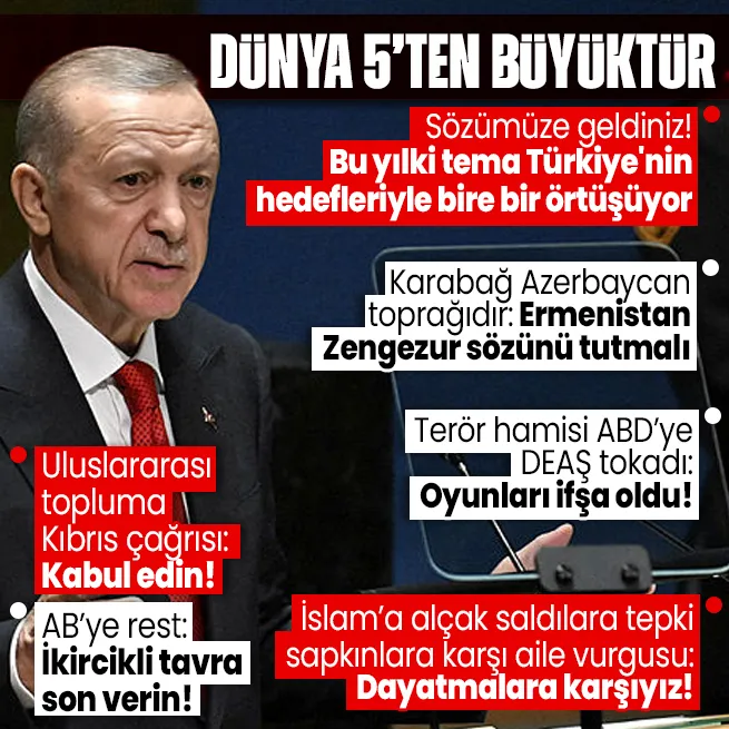 Başkan Recep Tayyip Erdoğan Birleşmiş Milletler 78. Zirvesi'nde tarihi bir konuşmaya daha imza attı. BM kürsüsünde bir kez daha "Dünya beşten büyüktür" ve "Daha adil bir dünya mümkündür" doktrinini tekrarlayan Başkan Erdoğan, Azerbaycan'ın dün Karabağ'da başlattığı terör operasyonu, dünyanın Kıbrıs ve Doğu Akdeniz konusundaki tutumu, LGBT terörü ve ABD'nin Suriye'de DEAŞ'ı bahane ederek açıkça terör örgütü YPG/PKK'yı silahlandırması hakkında kritik bir konuşma yaptı.