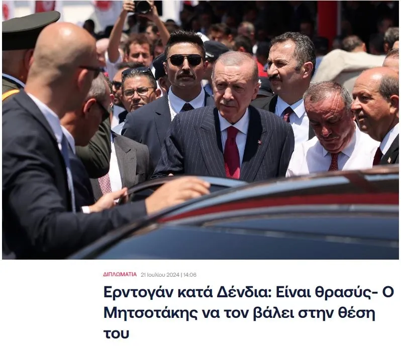 In.gr ayrıca, Türkiye Cumhurbaşkanı Recep Tayyip Erdoğan, Kıbrıs'ın işgalinin 50. yıl dönümü dolayısıyla düzenlenen şenliklere katıldığı işgal altındaki topraklardan dönerken provokasyonlara devam etti ve Nikos Dendias'a yönelik açıklamalarla geri döndü." şeklinde skandal ifadeler kullandı.