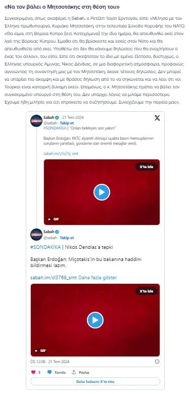 Yunan gazetesi, ayrıca, Turkuvaz Medya'yı da açıkça hedef gösterdi. Başkan Erdoğan'ın sözlerini Sabah gazetesini referans göstererek paylaşan In.gr, Sabah'ın uçak röportajı paylaşımlarını yayımladı.