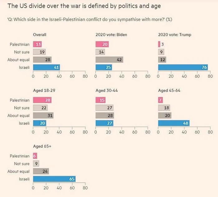 ABD'de Filistin sempatisi konusunda bir diğer faktör ise yaş olarak belirtiliyor. Financial Times, Amerikalı gençler arasında Filistinlilere İsrail'e göre daha açık destek olduğunu belirtiyor. 65 yaşın üzerindeki ABD'lilerde ise İsrail'e yönelik destek Filistin'e desteğin 10 katından daha fazla.