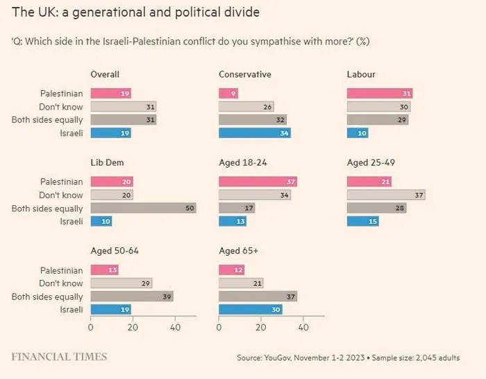12-24 yaş aralığındaki İngiltere vatandaşlarında Filistinlilere sempati duyma oranı 65 yaş üstü kişilere göre üç kat daha fazla iken her iki grupta da İsrail'i de Filistin'i de destekleyen veya kararsız olanların sayısı yaklaşık olarak aynı.