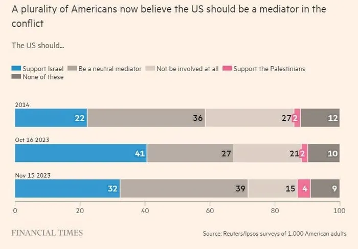 Kasım ayının ortasında düzenlenen bir Ipos anketi, Amerikalıların çoğunun ABD'nin tarafsız bir arabulucu olarak hareket etmesi gerektiğini düşündüğünü ortaya çıkardı. Anketin katılımcılarının çoğu İsrail'in Hamas'ın düzenlediği bir "terör saldırısına cevaben herhangi bir ülkenin verdiği tepkiyi verdiğini" düşünürken ankete katılan her üç ABD vatandaşından ikisi ise İsrail'in ateşkes ilan etmesi ve rehinelerin geri dönüşü için pazarlık yapması gerektiğini belirtiyor.