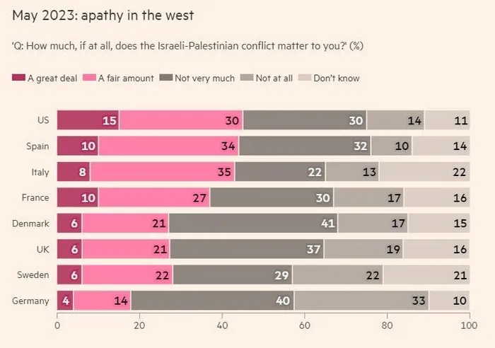 Filistin sorununun yıllardır süregelen bir çatışma alanı olduğunu belirten Financial Times, 7 Ekim'den önceki aylarda Batı Avrupa'nın büyük bir kısmında bu soruna yönelik yaygın tepkinin kayıtsızlık olduğunu hatırlattı.