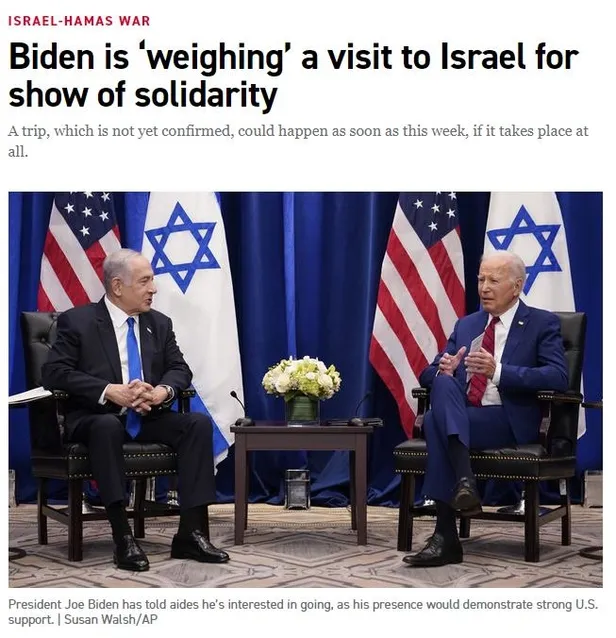 ABD gazetesi Politico ise Biden'ın bu hafta desteğini dünyanın gözü önünde bir kez daha vurgulamak için İsrail'e gitmeyi düşündüğünü fakat Tel Aviv'in Gazze'ye kara saldırısı emrini verme eşiğinde olduğu için savaşın kontrolden çıkacağını ve bu sebeple İsrail ziyaretini erteleyeceğini hatta hiç gidemeyeceğini iddia etti.