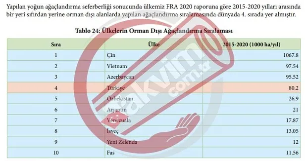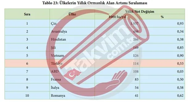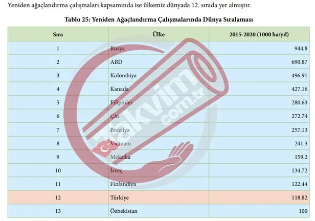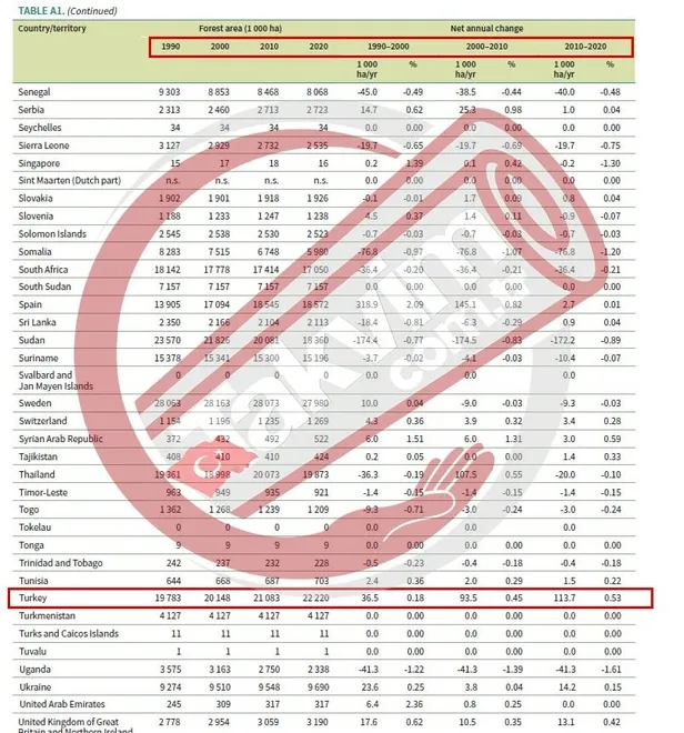 Rapora göre, 2015 yılında Türkiye, orman varlığını artıran ülkeler sıralamasında 46'ncı basamaktayken 2020 yılı itibarıyla 27'nci sıraya yükseldi. Aynı raporda Türkiye en çok ağaçlandırma yapan ülkeler sıralamasında, Avrupa'da birinci, dünyada ise 6'ncı sırada yer aldı.