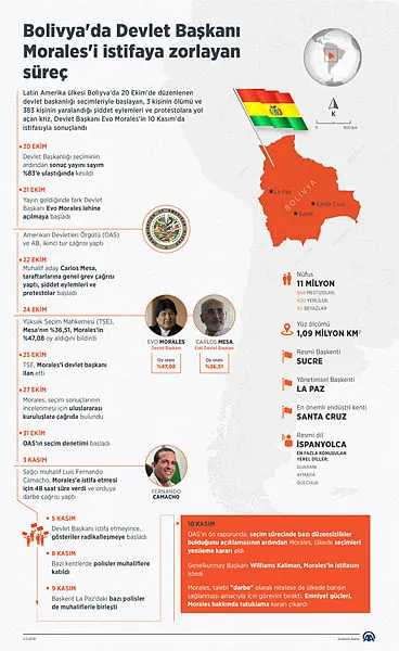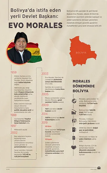 Bolivya'da 14 yıldır ülkeyi başarıyla yöneten ve dördüncü defa seçimi kazanan Devlet Başkanı Evo Morales zorla istifa ettirildi. 'Seçimlerde hile var' diye sokağa dökülen halka, ordu ve polis de destek verdi. Genelkurmay Başkanının 'istifa et' baskısıyla Morales görevi bıraktığını açıkladı. Ülkesindeki fakirliği yüzde 65'lerden yüzde 30'lara çekerek 3 milyon Bolivyalıyı fakirlikten orta gelir grubuna taşıyan, işsizliği yüzde 3.8'e, enflasyonu yüzde 2.1'e getirerek ülkeyi başarıyla yöneten Morales, ülkesindeki zengin yer altı kaynaklarının kurbanı oldu.