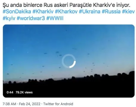 Çin merkezli TikTok'ta da paylaşılan ve 5 milyondan fazla izlenen videoda iki Rus askerinin Ukrayna'ya paraşütle indiği ifadelerine yer verilmiş fakat görüntülerin 2015 yılında paraşüt eğitmeni tarafından çekildiği ortaya çıktı.