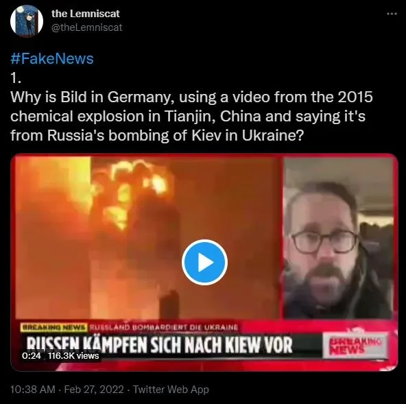 Bild gazetesinin yayınladığı habere göre, Rus hava saldırısından kaynaklandığı iddia edilen bir yangın gösterildi. Sonradan videonun 2015 yılında Çin'in Tianjin kentinde tehlikeli maddelerin bulunduğu bir depoda meydana gelen patlama sırasında çekildiği anlaşıldı.