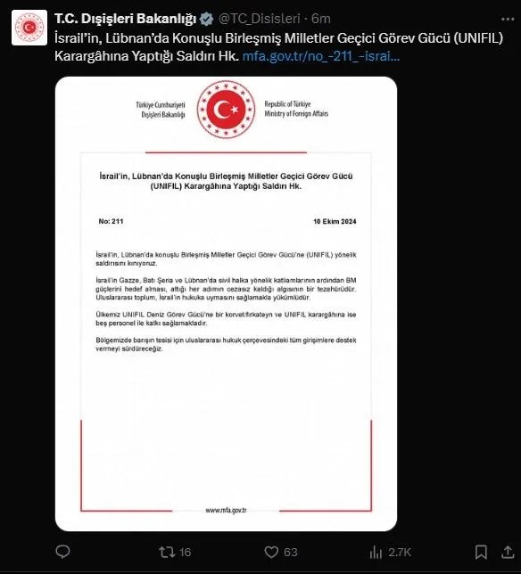 "İsrail’in, Lübnan’da konuşlu Birleşmiş Milletler Geçici Görev Gücü’ne (UNIFIL) yönelik saldırısını kınıyoruz.