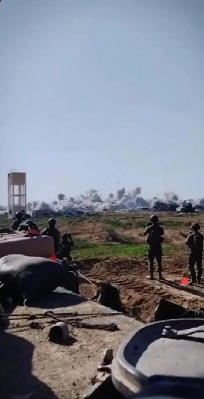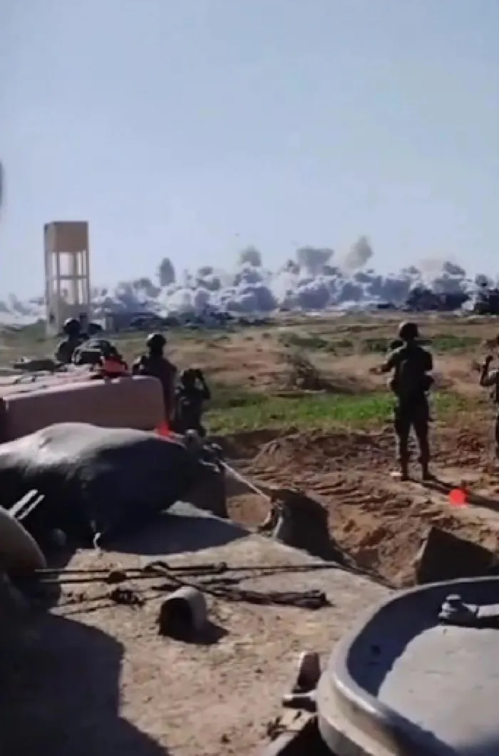 Tank üzerinden çekildiği anlaşılan görüntülerde; patlamanın gerçekleşeceği alanı güvenli bir mesafeden izleyen İsrail askerlerinin patlama esnasında sevinç çığlıkları attığı ve alkışladığı, yerleşim bölgesinin tamamında ise yoğun dumanların yükseldiği görülüyor.