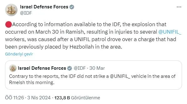 Lübnanlı güvenlik kaynakları daha önce Cumartesi günü BM'nin Lübnan Geçici Gücü'nün (UNIFIL) Rmeish köyündeki devriyesinin yakınında meydana gelen patlamadan İsrail'i sorumlu tutmuştu, ancak İsrail ordusu sorumluluğu hızla reddetti.