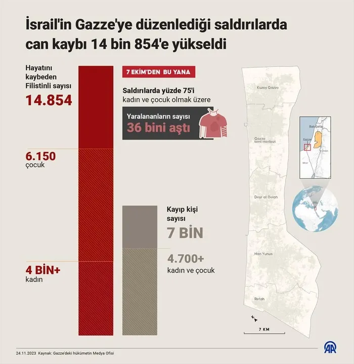 Gazze'deki hükümet, İsrail saldırılarında ölenlerin sayısının 15 bine yükseldiğini ifade etti.
