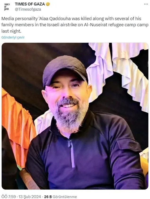 12.20 Filistinli sanatçı Alaa Qaddouha'nın da aralarında bulunduğu 5 kişi, İsrail'in bugün şafak vakti Gazze Şeridi'nin merkezindeki Nuseyrat kampındaki bir eve düzenlediği bombardımanda hayatını kaybetti.