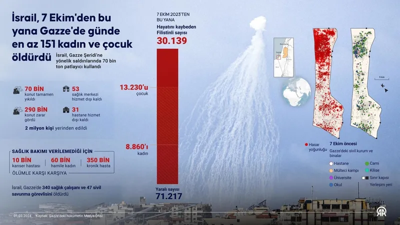 İsrail'in 7 Ekim'den bu yana Gazze Şeridi'ne düzenlediği saldırılarda en az 13 bin 230'u çocuk, 8 bin 860'ı kadın olmak üzere 30 bin 320 Filistinli öldürüldü, 71 bin 533 kişi yaralandı.