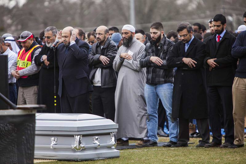 Chapel Hill kasabasındaki Kuzey Carolina Üniversitesi yerleşkesi yakınında bulunan evlerinde kendisini "ateist" olarak tanımlayan Craig Stephen Hicks tarafından silahla vurularak öldürülen 23 yaşındaki diş hekimliği öğrencisi Deah Barakat, 21 yaşındaki eşi Yusor Muhammed Ebu Salha ve 19 yaşındaki baldızı Razan Muhammed Ebu Salha'nın cenazeleri öğle saatlerinde Raleigh İslam Derneği mescidine getirildi.