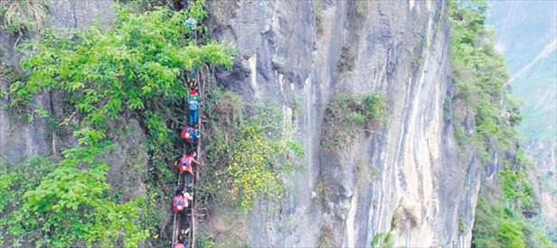 Eğitim, hiç bu kadar zor olmadı. Çin'in Sichuan bölgesi Atuler köyünde bulunan okula gitmek isteyen öğrenciler, 90 derecelik açıya sahip çok tehlikeli uçurumun üzerinde merdivene tırmanıyor. Yaşları 6 ile 15 arasında değişen öğrenciler, hiçbir güvenlik önlemi olmaksızın okula gitmek için her gün hayatlarını riske atıyor. Bugüne kadar tehlikeli yolculuğu yapan 8 kişinin hayatını kaybettiğini belirtildi. Sosyal medyada öğrencilere güvenli ulaşım sağlanması için çağrı yapıldı.