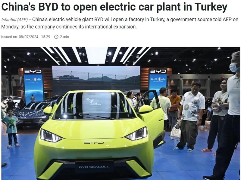 France 24 ise Çin'in elektrikli araç devi BYD'nin uluslararası büyümesini sürdürürken Türkiye'de fabrika açacağını belirtti.