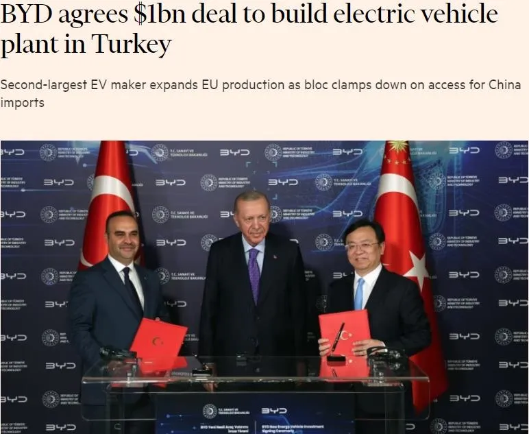 İngiliz Financial Times "BYD, Türkiye'de elektrikli araç fabrikası kurmak için 1 milyar dolarlık anlaşma imzaladı" dedi ve en büyük ikinci elektrikli araç üreticisinin Çin'den ithal edilen ürünlere erişimi kısıtlarken AB üretimini artırdığını belirtti.