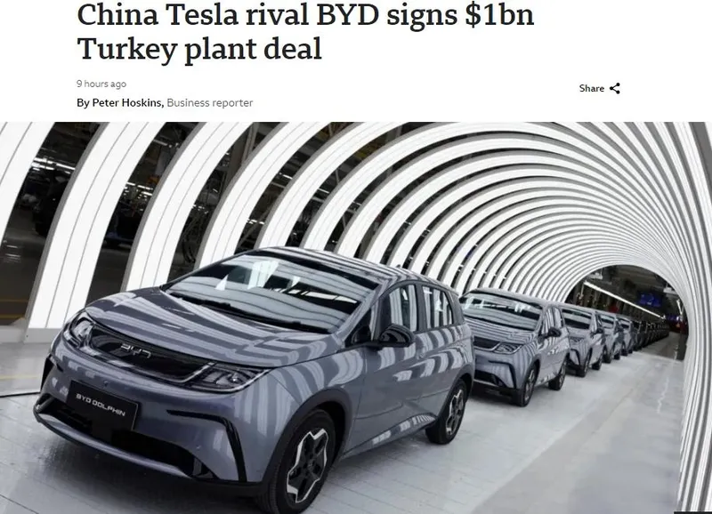 BBC "Tesla'nın Çinli rakibi BYD, Türkiye'de 1 milyar dolarlık tesis anlaşması imzaladı" başlığını kullandı ve tesisin 2026 yılı sonuna kadar üretime geçmesi ve yaklaşık 5 bin kişiye istihdam sağlamasının beklendiğini belirtti.