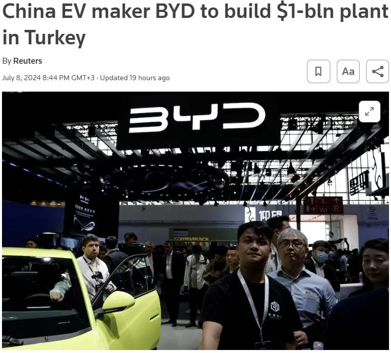 İngiliz Reuters, Çinli elektrikli araç üreticisi BYD'nin Türkiye'de 1 milyar dolarlık tesis kuracağını belirtti.