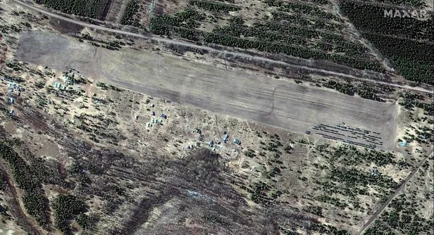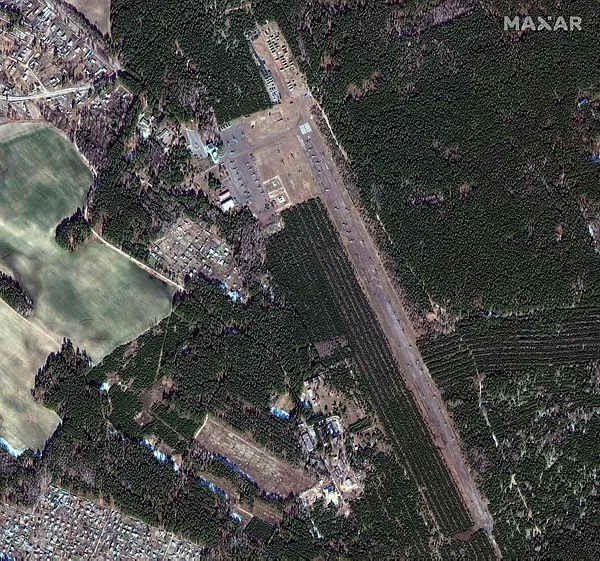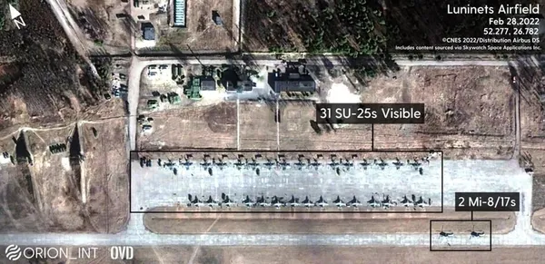 16.26 Bu sabah çekilen bir uydu görüntüsünde Belarus'un güneyindeki Luninets hava üssünde 31 adet Su-25 ve iki Mi-8/Mi-17 çok amaçlı helikopter görülüyor.