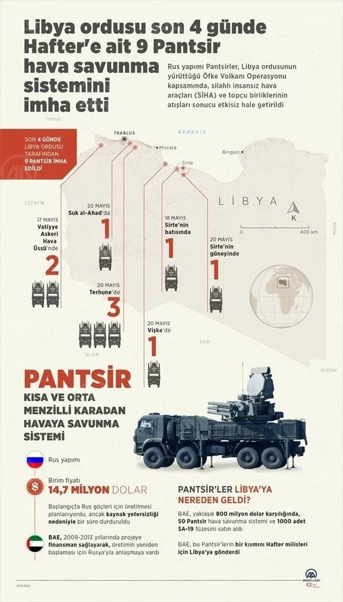 Açıklamada ayrıca, Birleşik Arap Emirlikleri'nin (BAE) Hafter milislerine temin ettiği bu sistemlerin, BAE'nin yaklaşık 800 milyon dolar karşılığında Rusya'dan satın aldığı 50 Pantsir sisteminin bir kısmını oluşturduğu kaydedildi.